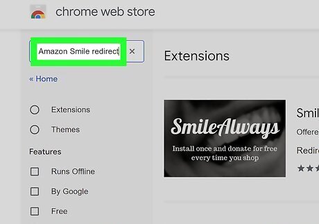Search for an extension to redirect you to Amazon Smile. Try searching for “Amazon Smile redirect”. Smile Always and Amazon Smile Redirect are popular and free. Click Add to Chrome to download.