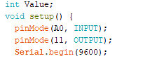 Prosetup.pngProgram the Arduino (Void Setup). Before the Void setup, initialize a variable as an integer by typing "int Value;" "void setup()" is where functions are ran before the Arduino goes through a loop In the void setup() set your pins by typing "pinMode(A0, INPUT);" and "pinMode(11, Output);". This will initialize the pins. Pin A0 will become an analogue input and pin 11 becomes a digital output. Pin A0 will read the voltage received from the circuit from 0V-5V and set it as a value between 0-1023. This is essentially 0.0049V per unit. Type in "Serial.begin(9600)" to begin a serial connection. This will allow you to read the values of the analog input in the loop