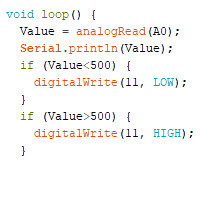 Program the Arduino (Void Loop): Using the Value To use the value, you can type an if/else statement after the code to read the value. Type in "if (Value500) { digitalWrite(11, HIGH); } This code means if pin A0 is reading a value lower than 500 pin 11 will turn off (The LED should not be lit), but if pin A0 reads a value higher than 500 pin 11 will turn on (The LED should be lit).