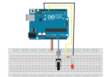 Set up your Arduino Board and Circuit. Plug in the Arduino into the computer Set up a Circuit with a potentiometer, where the 5V pin is connected to the right pin of the potentiometer, the A0 pin is connected to the middle pin of the potentiometer, and left pin of the potentiometer is connected to ground. Set up another circuit with an LED by connecting an LED with a 220 Ohm resistor to a digital I/O pin.