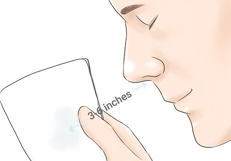 Pour a few drops on to a handkerchief to smell the aroma for a moment. Sniffing the entire bottle directly can be kind of overwhelming. To make the aroma more palatable, pour 3-4 drops of the oil directly into a clean cloth or handkerchief. Hold the oily cloth 3–6 inches (7.6–15.2 cm) under your nose, close your eyes, and inhale slowly to take the aroma in. Closing your eyes is especially important if you’re using peppermint, which can really irritate your eyes if the odors are too strong. This is the best way to quickly inhale the aroma. The oils will dry out on the cloth after a few minutes but the scent should linger for quite some time. When it does dry out, you can either add more oil or use the dry cloth as a way to inhale a softer form of the scent.