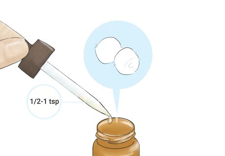 Fill a vial with the oil and a cotton swab to take it on the go. Grab a small, airtight vial or bottle. Pour ⁄2–1 teaspoon (2.5–4.9 mL) of the essential oil into the container. Then, stuff 1-2 cotton balls inside of the container and push them down until the bottom of the cotton balls come in contact with the essential oil. This is a great way to take the oil with you and take sniffs as needed to curb your nausea. Inhale the aroma by holding the opening of the bottle 4–6 inches (10–15 cm) away from your nose. Close your eyes while doing this to keep the fumes out of your eyes.