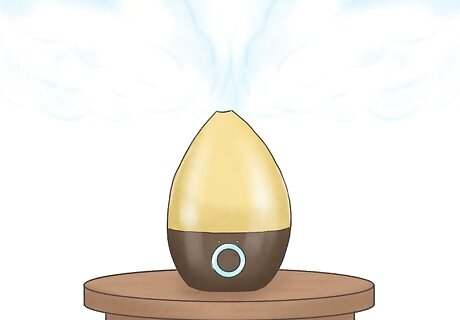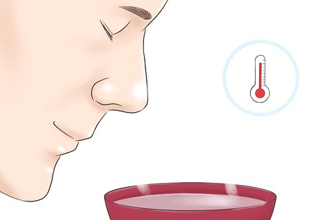 Add a few drops to hot water to inhale the steam and clear your sinuses. If you have a stuffy nose and you’re nauseous, this is probably the best way to deliver the aroma. Boil some tap water on the stove and turn the heat off after the water reaches a rolling boil. Then, pour 3-4 drops into the water. Tilt your head 8–12 inches (20–30 cm) over the water and inhale the steam slowly. Peppermint and lemon tend to be the best options if you’re trying to clear out your nose. This should also make it easier to breathe while your nose is clogged. The steam will loosen up any mucus or blockages in your sinuses. The steam should soften the aroma enough that you don’t need to close your eyes. Go ahead and close them if the fumes are too much for you, though.