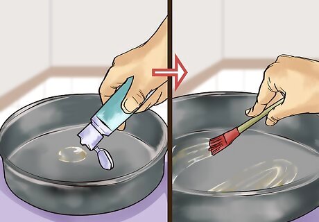 Spread the liquid cake release mixture. Squirt about a quarter-sized amount of liquid cake release mixture onto the bottom of your cake pan. Take a silicone brush or pastry brush with bristles and dip it into the cake release mixture. Spread the mixture over the entire surface of your baking pan. Ensure that you coat the bottom, the sides, and the inner edges of the pan. Don't worry about applying too much cake release mixture. You won't be able to see it on the baked and cooled cakes.