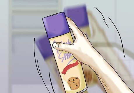 Shake the can and spray. Thoroughly shake the can of cake release spray for several seconds. This will help the product combine and ensure that the flour and oil are evenly distributed. Place your finger on the nozzle of the can and spray the entire surface of your baking pans. To avoid overspray, keep the can about 6 inches away from the baking pan while you spray. Avoid spraying around an open flame or sparks. Baking spray from a can is highly flammable.