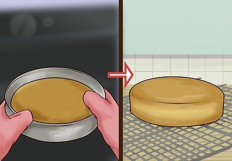 Bake and release your cake. Remove the baked cake from the oven and set a cooling rack on top of the cake and hold the sides of the cake pan along with the rack. Carefully lift the cake and rack up and over so the cake pan is upside down. Gently lift the cake pan up and away so the cake is left on the rack to cool. Avoid letting the cake cool in the pan. This will make it harder to release from the pan. Wear oven mitts when handling the hot baking pans.