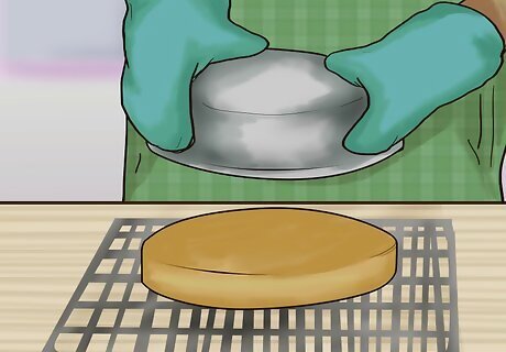 Remove your baked cake from the pan. Once you've baked the cake according to the recipe, remove it from the oven. Set a cooling rack on top of the cake and hold the sides of the cake pan along with the rack. Carefully lift the cake and rack up and over so the cake pan is upside down. Gently lift the cake pan up and away so the cake is left on the rack to cool. Avoid letting the cake cool in the pan. This will make it harder to release from the pan.