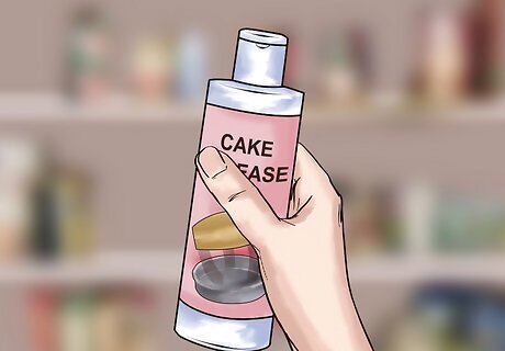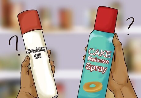 Choose a cake release spray. Look for a cake release spray that contains flour and oil as it's main ingredients. You'll also notice stabilizers and propellants which will extend the shelf life of the spray and help it spray out of the can. You can also look for a cooking oil spray that doesn't contain the flour. If you use a cooking oil spray (like a canola or vegetable oil spray), avoid using it on nonstick baking pans. The oil will become sticky after baking on the nonstick surface.