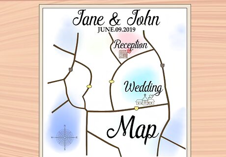 Hand out calligraphy maps for a destination wedding. If you're having a destination wedding, send a map. A map can be a memento for guests and can also be used to help guests find their way to a tricky location. You can have the writing on the map written in calligraphy, giving it an old fashioned feel. If there are important or complicated directions on the map, it may be best to refrain from using calligraphy in these portions of the map. You want to make sure guests know where to go.