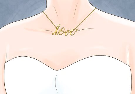 Wear accessories with calligraphy. Look for accessories that make use of calligraphy. You can go for a watch with a calligraphy encryption, a necklace with a calligraphy pendant, or have the wedding rings include calligraphy. The bride or groom can wear calligraphy or you can have members of the wedding party add it to their accessories. For example, have all the bridesmaids wear a necklace with a calligraphy pendant.