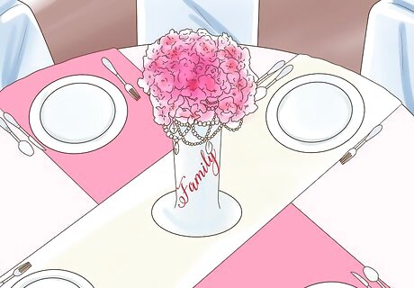Use calligraphy vases as centerpieces. If you're using centerpieces at wedding tables, add calligraphy lettering. This can be an easy way to add calligraphy to your ceremony. You can write down words like "Friends" and "Family," depending on who is sitting at what table. You can also write you and your spouse's name or initials.