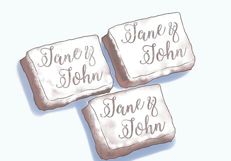 Add calligraphy toppers to desserts. You can buy toppers with words written in calligraphy letters. You can use these in desserts like cupcakes and brownies. Dessert toppers can be a cute way to add calligraphy to your wedding day while also giving guests something to take home with them as a memento. You can use you and your spouse's initials in dessert toppers. You can also write out words, such as "Love" and "Forever," that reflect a wedding.