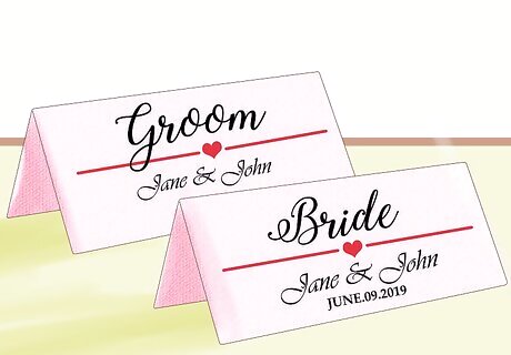 Use calligraphy place cards. If you're having a big reception dinner, you may use place cards to indicate where people should sit. Using calligraphy on the cards can be a fun way to incorporate calligraphy into your big day. If you don't want to use traditional place cards, use something like a small stone or statue with calligraphy lettering. This way, guests can take home a memento.
