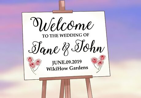 Welcome guests to the wedding with a calligraphy sign. When guests enter your wedding, you can have a calligraphy sign near the entrance welcoming them. You can use a material that matches other themes of your wedding. For example, if you're going for an outdoor theme, you can use a wooden sign embellished with leaves. In addition to writing "Welcome" on the sign, you can write something like you and your spouse's names.