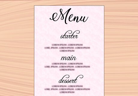 Opt for calligraphy menus. If you're serving food or drinks, you may include menus for guests. If you do, use calligraphy lettering. This can be a fun and practical way to add calligraphy to the reception. You may want to write descriptions of food and drink in regular lettering. You want to make sure guests can read the descriptions of drinks and cocktails.