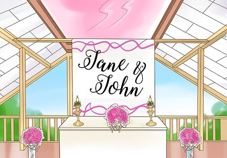 Place a calligraphy sign near the alter. Just behind the alter, consider hanging up a calligraphy sign. You can also hang up something like a large tapestry or rug embellished with calligraphy. Choose something nice to write on the sign. Some couples like to simply write their names, but you can also write a quote about love, lyrics from a special song, or other sentimental words or phrases.