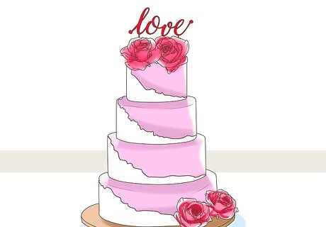 Add calligraphy to the cake. You can have something written on the cake in calligraphy. Instead of a traditional couple wedding topper, have cut out calligraphy lettering as your topper. You can have the name or initials of the bride and groom. If you're using a wedding hashtag, you can also use that as the wedding topper. If you want a traditional couple cake topper, see if you can get a baker to write something on the cake in calligraphy letters. You can, for example, have you and your spouse's name written on the side of the cake.