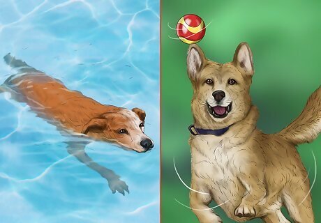 Exercise your dog often. Exercise may not completely solve your dog's emotional or behavioral problems, but it can help. Exercise reduces your dog's anxiety levels, burns off extra energy, and leaves your dog tuckered out afterward. Your dog should get at least 30 minutes of aerobic activity each day. This can include running, a fast-paced walk, swimming, or just playing catch in the yard. Try to time your dog's exercise so that it coincides with your departure. Giving your dog a good workout right before you leave will keep them tired throughout the day.