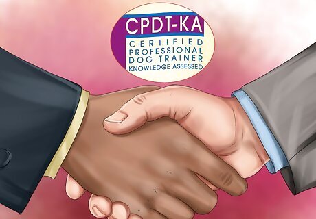 Hire a trainer or behaviorist. If you decide to work with a trainer or behaviorist, you will have many options. You can choose between group classes or one-on-one sessions. You will also need to decide what type of certification you want your dog's professional to have. This decision will largely depend on your dog's needs. For anxiety or aggression issues, you'll probably want a specialist with both academic and hands-on experience. Knowing about the various certifications and titles can help you make a more informed decision. Trainers sometimes use titles like behavior counselor, pet psychologist, or pet therapist, but the education and experience within this group vary considerably and may not be consistent. Certified Professional Dog Trainers (CPDTs) are certified only after working a minimum number of hours as a trainer and passing a test. CPDTs must also engage in continuing education classes to maintain their title. Applied Animal Behaviorists (AABs) may have a master's degree or Ph.D., while Certified Applied Animal Behaviorists (CAABs) have a doctoral degree. Associate Certified Applied Animal Behaviorists (ACAABs) have a master's degree and received supervised training in animal behavior and biology.