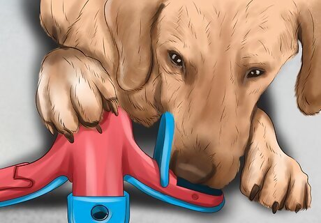 Desensitize your dog. One way to help ease your dog's separation anxiety is to make it less stressful when you leave the house. If your dog sees you leaving as a big deal, it will only increase your dog's behavioral problems (and the subsequent destruction that may follow). Make your daily departures and arrivals less dramatic by resisting the urge to rush to your dog when you come home or fawn over them every time you leave. Leave food-based puzzle toys for your dog. These may include a hollow ball or cone stuffed with tasty treats like peanut butter or cheese. Try hiding pieces of scattered kibble or treats around the house before you leave. This hunt for food will keep your dog busy and reduce the chances of them feeling anxious.