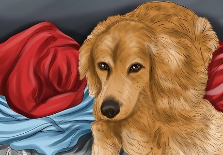 Make your dog feel comfortable at home. Your dog probably feels comfortably "at home" already in your dwelling, but your dog may not feel safe from harm or abandonment. You can help reduce your dog's separation anxiety by making your pet feel comfortable, safe, and secure, even when you're not there. Leave dirty laundry that smells like you lying on the floor so your dog can still smell your scent. Give your dog a designated area where they can feel safe. This may be a room with windows, or a crate (if and only if your dog responds well to crate training). Crates may not work for all dogs, but if your pet feels that their crate is a safe space, it may reduce your dog's anxiety to be in the crate when you're not home. Be aware that a dog that does not feel safe in a crate will still exhibit anxiety symptoms, though it will occur in the crate. This can lead to injury if the dog attempts to escape, and it may cause discomfort if the dog goes to the bathroom inside the crate.