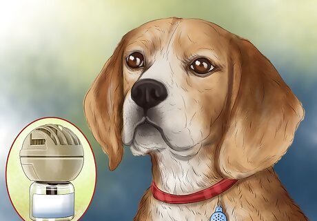 Reapply as necessary. Regardless of which application method you choose, you will need to periodically reapply the pheromones to your dog or your dog's environment. How frequently this happens will depend on the application method and the specific brand you choose. Sprays generally last up to four hours and can be applied directly to an article in the dog's environment (like a bandana it wears or the dog's bed) or sprayed throughout a room. Some sprays last up to 24 hours when dispersed in a room. This will vary considerably by product and application method. Collars and diffusers typically last up to one month. You can set an alarm on your phone to remind you to respray the dog's bandana, bed, or the room. For collars and diffusers, you can mark your calendar so you remember to reapply the pheromones each month. The collars need to sit against the skin, so be sure to part the hair in long coated breeds, and make sure the collar fits snuggly (but not too tight).