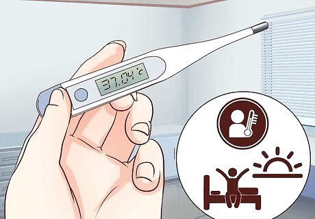 Take your temperature every morning before you get out of bed. Make sure you take your temperature as soon as you wake up. Do not do any activity before you take your temperature, such as talking, eating, having sex, or smoking. Place the thermometer in your mouth or your rectum for a full five minutes. This will give the thermometer enough time to correctly read your temperature. If you are using an oral thermometer, make sure the tip of the thermometer is under your tongue on the soft flesh at the base of your tongue.