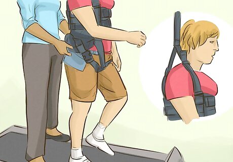 Walk on a treadmill. While being supervised by your physical therapist or caretaker, you can start walking on a treadmill to build strength and mobility back into your legs. Go at a very slow pace, and make sure you are holding onto the treadmill. Don't attempt to walk on the treadmill without supervision. Your physical therapist may recommend you use a weight support brace if you not yet able to keep your body upright for long. Your physical therapist may also recommend a stair climber if you are having difficulty lifting your legs or going up stairs. If you live in a place with stairs or steps, ask your therapist if this will be feasible for you.