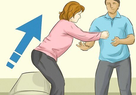 Practice moving from sitting to standing. When you are comfortable with leaning forward, you can try standing as you reach out. Keep your hands clasped, and slowly rise as high as you can from the chair. If you cannot stand completely yet, do not push yourself. Simply lower yourself back to the chair. Never try this unless you have someone there with you to catch you if you fall.