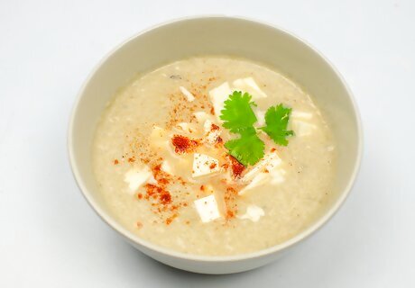 Sprinkle some queso fresco over some spicy soup. Finish off an especially heavy or spicy soup with some mild, creamy cheese. After ladling soup into 4 bowls, divide ¼ cup of queso fresco over the surface, along with some other vegetables and garnishes. If you can’t decide on a fresh topping for your soup, use a combination of onion, cilantro, and avocado—these will taste great with the queso fresco and balance it out well. For example, try sprinkling some queso fresco over a bowl of lime avocado soup.