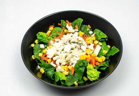 Top off a light corn salad with some crumbled queso fresco. Prepare a corn salad, or whatever type of salad you prefer the most. A typical corn salad contains a variety of diced vegetables, including peppers, onions, and chiles. Once you’ve finished assembling the ingredients into your own salad, combine the vegetables in a bowl along with 2 cups (244 g) of queso fresco. Be sure to toss the salad afterwards so the cheese is spread evenly throughout.