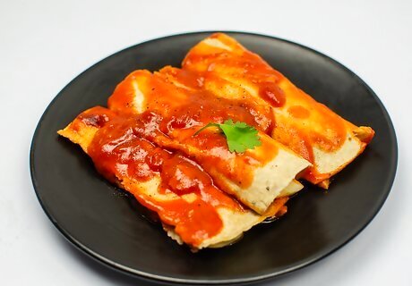 Prepare some tasty enchiladas stuffed with queso fresco. Assemble your ingredients and dip the corn tortillas into the enchilada sauce as you normally would. Before rolling up your enchiladas, spoon some crumbled queso fresco into the center of each tortilla. For 4 servings of enchiladas, divide 2½ cups (305 g) of queso fresco between 8 tortillas. Enchiladas taste great when garnished with fresh vegetables like lettuce and radishes, as well as sour cream!
