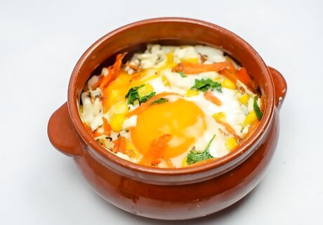 Crumble some queso fresco over your Huevos Rancheros. Set a warmed flour tortilla onto a plate and fill it with a variety of beans, peppers, and tomatoes. The specific ingredients may vary per recipe, but many standard dishes include pinto beans, diced tomatoes, green chiles, and cooked eggs. Layer on these items until they fill the center of the tortilla, leaving only 1 inch (2.5 cm) of uncovered space around the edge. Sprinkle some crumbled queso fresco over the top as a finishing touch. Each tortilla will have about ¼ cup (30.5 g) of queso fresco on it.