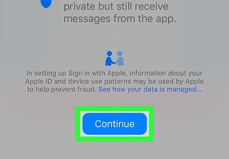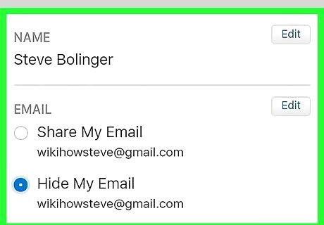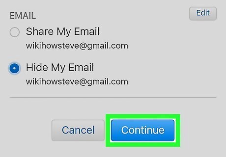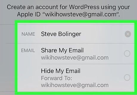 Enter any details requested by the site or app. Some sites and apps require you to enter account details, like your name or address, to create an account. Since you chose Sign in with Apple, information from your Apple ID will automatically appear in the blanks. Edit any of that information as needed. Signing in with your Apple ID gives you the option to hide your real email address from the site or service. If you don't want to provide your email address to the site, select Hide My Email.