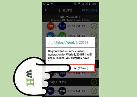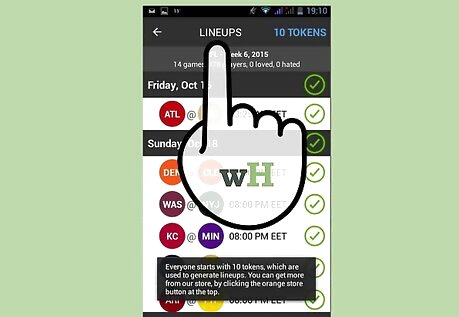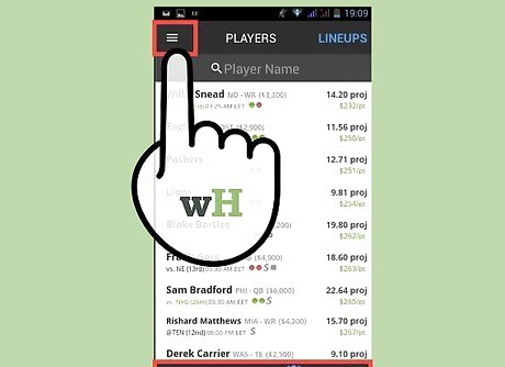 Create a fantasy lineup for the contests you want to participate in. DraftKings offers up a list of players from upcoming games for you to pick. It also offers useful stats like Fantasy Points per Game (FPPG) and Opponent Ranking vs Position (OPPG) to help you identify potential picks for your draft. Select the league you want to create a lineup in, like the NFL for the nationals and the CFB for college football. Fill in the roles with the players you want. You’ll have to pick one quarterback (QB), two running backs (RB), three wide receivers (WR), one tight end (TE), one flexible position (FLEX) and one defense/special (DST). Remember to stay under the salary cap of $50,000. Make sure to review player stats to help you gauge if your choice is worth the money it will cost to import them into your fantasy football team. Do as much research as you can on your potential lineup. The DraftKings app provides some information, but knowing what you can about the picks in your draft – from recent injuries to the consistency of their performance throughout multiple games – will play a huge role in giving you the edge over your competitors. Submit your lineup when you’re ready.