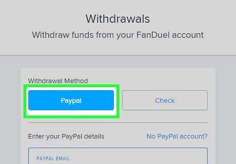 Withdraw through PayPal. Selecting this option will by default withdraw funds to the same PayPal account you used to deposit cash into the account. If you don’t have a PayPal account linked to your FanDuel account, or wish to use a separate PayPal account to receive those funds, FanDuel will perform additional security checks. Provide the requested information as necessary and submit it all in order to get your PayPal withdrawal request started up. The transfer should be completed within 48 hours or in the next business day should the request be made during a weekend.