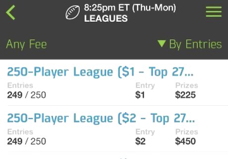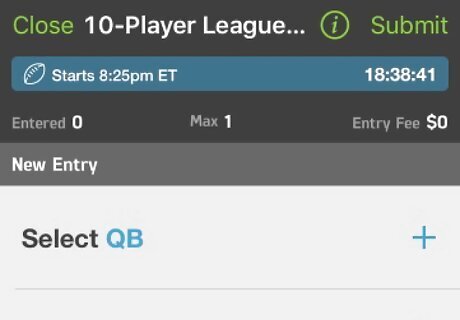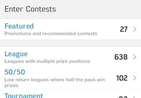 Select the type of contest mechanics you want to work with. Immediately after selecting the games you want to play in, you will be led to a screen with a list of contest types. Simply tap the contest mechanics you wish to work with and you should be good. Featured contests are contests being promoted by FanDuel. League contests have multiple prize positions that dole out prizes that go up in increments for those who place accordingly. 50/50 where the upper half of the participants receives double the fees they paid to join contests. This is also called double-ups. Tournament is similar to League contests except there are a lot more participants and significantly larger prize pools. Head to Head is a competition between two players, with the winner taking all of the advertised prize money. Multiplier winners will receive their prize entry multiplied by a certain number, usually between five to ten times what they paid to join.