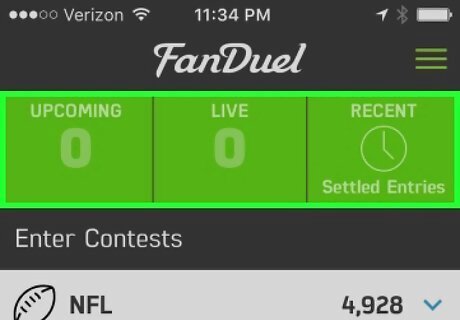 Review your contests. The FanDuel home screen has three sections where you can review upcoming contests that you have rosters lined up for, live contests that are going on at the moment, and recent contests that you’ve participated in. Tapping the “Upcoming,” “Live,” and “Recent” buttons on the home screen will allow you to review the contests and the lineups you drafted for each of them. Use this to have an easier time staying updated on the status of your players before the contest begins, tracking how well your rosters are performing in ongoing games, and reviewing their post-game statistics.