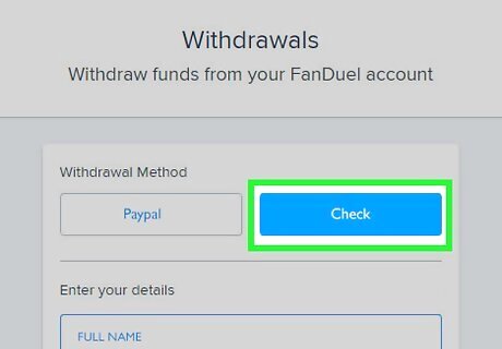 Withdraw through paper check. Selecting this option will lead you to a screen with boxes requesting your name, the amount you want to withdraw and your complete address. Provide the information required and hit “Submit” to begin the withdrawal process. If you plan to withdraw earnings in excess of $250 using paper checks, FanDuel will ask for a valid mailing address as well as you social security number. This is for both security and tax-related purposes. Paper checks will need 7-10 days to clear out. You may need to submit a ticket to FanDuel’s support page indicating your intent to withdraw using checks if you encounter troubles withdrawing cash via the FanDuel app.