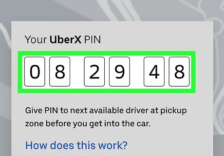 Provide the PIN to the driver before getting in the car. The PIN will appear on the screen in the app. The driver will then enter it into their version of the app. Once the PIN is verified, you'll see a message on your screen that says "Your ride is verified." If you do not see a verification message on your screen, the driver has either mis-entered your PIN or is not the Uber driver who was assigned to pick you up. Don't get in this particular Uber if the ride cannot be verified.