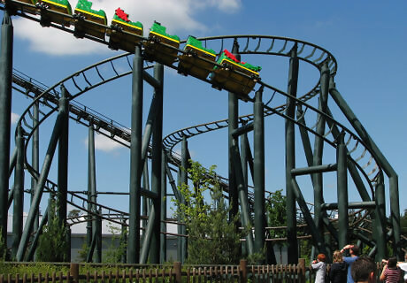 Ride the Flying School roller coaster. You'll feel like you are flying in a hang-glider under more extreme g forces around some tight curves and corners. No helixes exist on this ride, so don't worry about that.