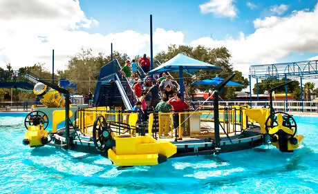 Ride the "AQUAZONE Wave Racer." This power ski-like ride is positioned around a small moat as you dodge water blasts from water blasters positioned on the outside of the moat looking in. Be careful though, as on this ride you'll be standing on the wave runner the entire time.