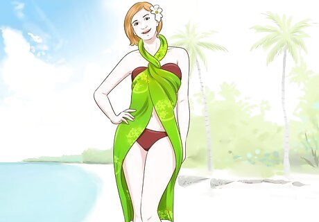 Wear a sarong for versatility. A sarong is a long, loose-fitted piece of fabric you can style in a variety of ways. A sarong is great because it provides versatility. You can tie the sarong differently for different looks throughout your day at the beach. You can create a loose dress with a sarong by wrapping it around your chest. Then, take the two ends and tie them around your neck to secure the sarong, creating what sort of resembles a halter top. Try tying two ends of the sarong around your chest. Then, wrap the rest of the sarong around your body a few times. Tie the ends together when you run out of fabric to create a form-fitted dress.