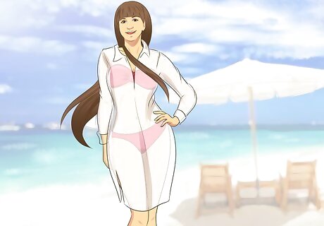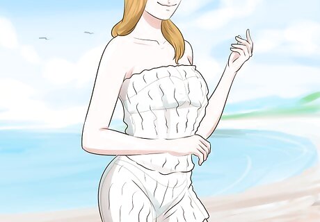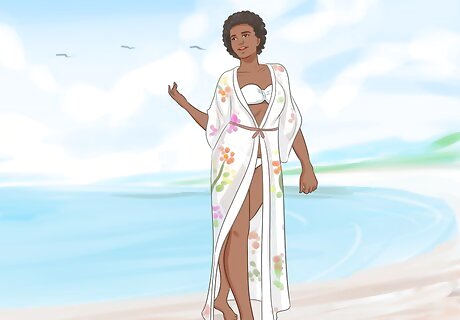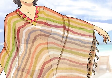 Drape a poncho over your suit. A large poncho is big and baggy enough to cover a swimsuit. If you're looking for a more casual cover, invest in a sizable poncho. Ponchos come in a variety of styles, so you can experiment with things like patterns and colors. Lightweight material usually works best for a beach look, as it allows your suit to dry underneath.