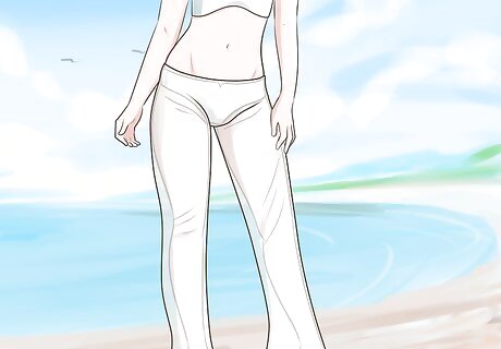 Try long, loose pants. Get a pair of long and loose beach pants. Drawstring or elastic wait pants can be a great cover when you want to slip away from the beach for a bit or if you get cold. Baggy pants come in a variety of styles and patterns. Look for something that matches your swim top. A patterned swim top would go great with solid colored pants and vice versa. Opt for waterproof or semi-waterproof materials, like mesh pants.