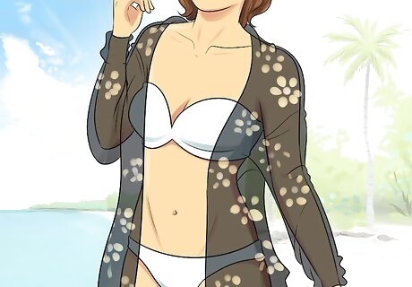 Opt for a long, loose jacket. A jacket can be easily worn over a swimsuit top. Opt for a longer, looser jacket made from a lighter fabric. Go for a cover up jacket without buttons or zippers that can simply be wrapped around your suit when you want to cover up.