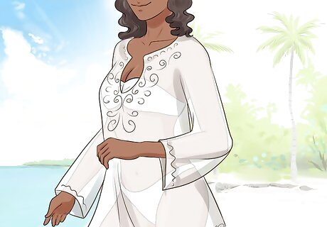 Opt for a caftan. A caftan is a long, loose flowing dress. It can work great for a beach cover if you want something less revealing. It's easy to throw a caftan on over a damp swimsuit if you want to go out for lunch or do some shopping. Caftans can come in solid colors or patterns. You can choose any design caftan that works for your style. As caftans are big enough to cover your entire suit, it's not necessary to match your caftan with your suit's color or design.