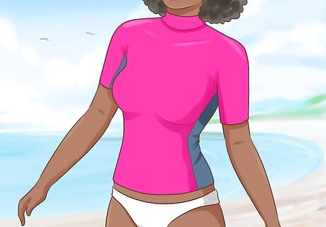 Look for a form fitted t-shirt. If you want something a little more stylish, opt for a form-fitted t-shirt to throw on over your suit. Make sure to choose a material that is water resistant, as this shirt will be pressing against your swimsuit. Rash Guard t-shirts, for example, can be made to match a suit.