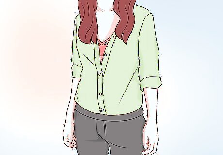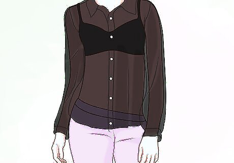 Wear a button-down shirt over the bralette. This is a great option because you can control how much skin you want to show. You can unbutton one or two buttons to show only the trim of your bra. Or unbutton the shirt enough so the top of the bralette shows. Wear the bralette with white button-down shirt, black slacks, and brightly colored stilettos or ballerina flats for a night out.