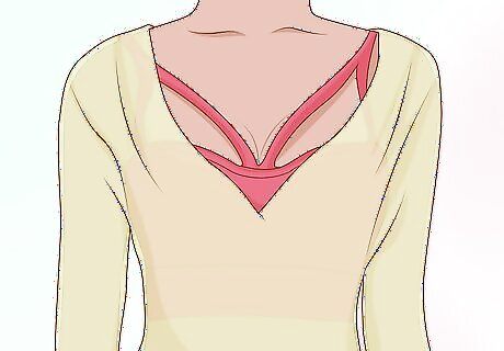 Show only a peek of the bralette. You can show off a little bit of the bralette while staying modest. Wear a V-neck sweater or shirt that doesn’t come down very far, but does reveal some of your chest. Make sure the top is low enough so that it would show the top of your bralette. Choose a bralette that is trimmed in lace. Wear a V-neck shirt that shows only the trim of the bralette.